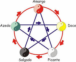 Nessa relação com os Wu Hsing,  o Elemento Madeira está associado à cor verde e ao sabor Ácido, o Elemento Fogo à cor vermelha e ao sabor Amargo, o Elemento Terra à cor amarela e ao sabor Doce, o Elemento Metal à cor branca e ao sabor Picante, e o Elemento Água à cor preta e ao sabor Salgado.  Cada um deles com sua caracteristica e  função  energética próprias , como saborespor exemplo a pimenta, de sabor picante que ativa a circulação de energia e faz suar; ou como o chá verde, de sabor amargo, que reduz o calor do corpo.