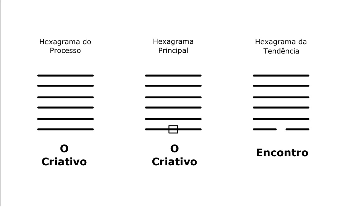 O Criativo – este é um Hexagrama duplo, composto por dois Trigramas “Céu” sobrepostos, e simboliza o Pai, o Céu, o espírito, a força detonadora, o poder criativo, a absoluta atividade, a concretização, a expansão, a realização da vontade.