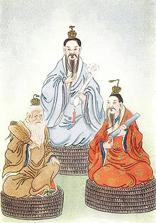 “Essa fase é conhecida como a Era dos Três Reis Celestiais, considerados pelo Taoismo como os grandes patriarcas do ensinamento. É um tempo que não tem início definido e leva suas raízes até os dias de hoje, com a Era dos Cinco Imperadores Sábios, que sucederam os Três Reis. Os Reis Celestiais, ou Reis Sagrados, são o Rei do Céu (Tian Huang), da Terra (Di Huang) e do Homem (Ren Huang). E os Imperadores Sábios correspondem, respectivamente, às cores e virtudes dos cinco elementos naturais: madeira, fogo, terra, metal e água. Fi Xi, o Imperador Azul, representa a bondade; Shennong, o Imperador Vermelho, a polidez; Huangdi, o Imperador Amarelo, a sinceridade; Shaohao, o Imperador Branco, a justiça; e Zhuanxu, o Imperador Negro, representa a sabedoria.