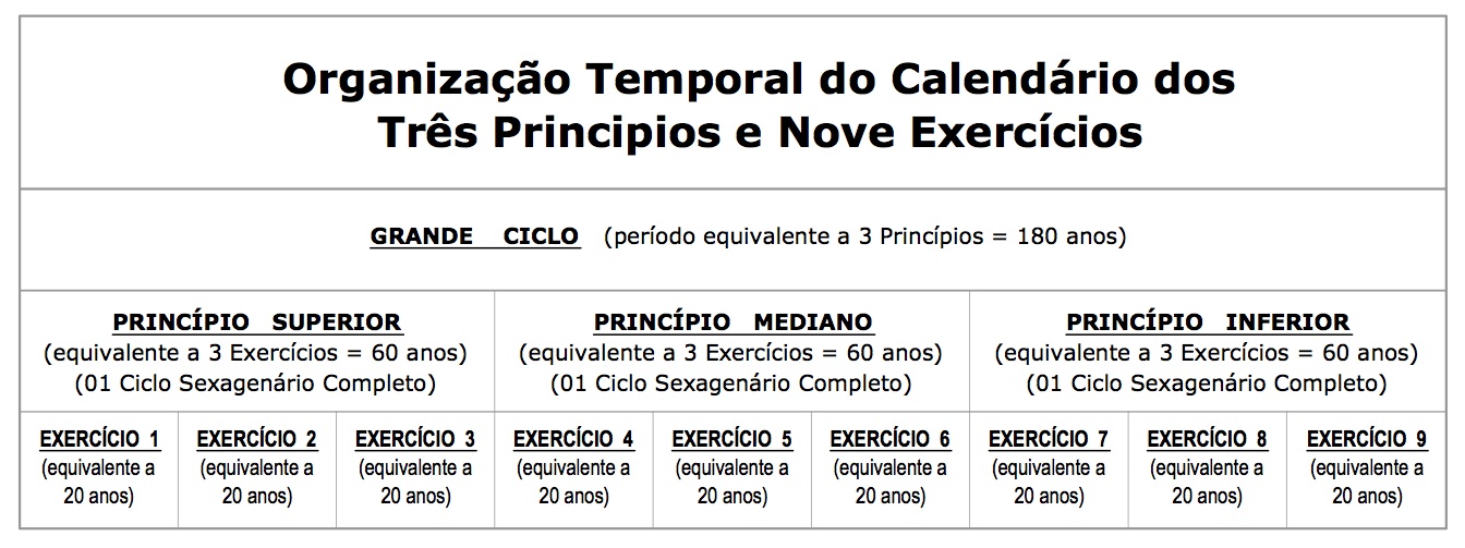 Portanto, o Calendário dos Três Princípios e Nove Exercícios, através do Ciclo Sexagenário, apresenta a evolução energética no Espaço ao longo do Tempo e segundo os diferentes períodos de duração assinalados abaixo: