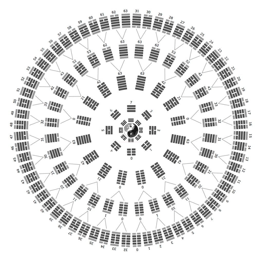 - Os restantes hexagramas, de 32 a 63, todos com a primeira linha firme (Yang) são ordenados no sentido horário, novamente a partir do nadir e até ao zênite;
