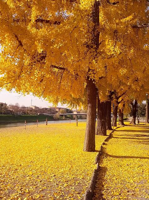 Esta linda, pré -historica e sagrada árvore oriental, que vive milhares de anos e sobreviveu a uma bomba atômica dá um show de beleza dourada no outono.
