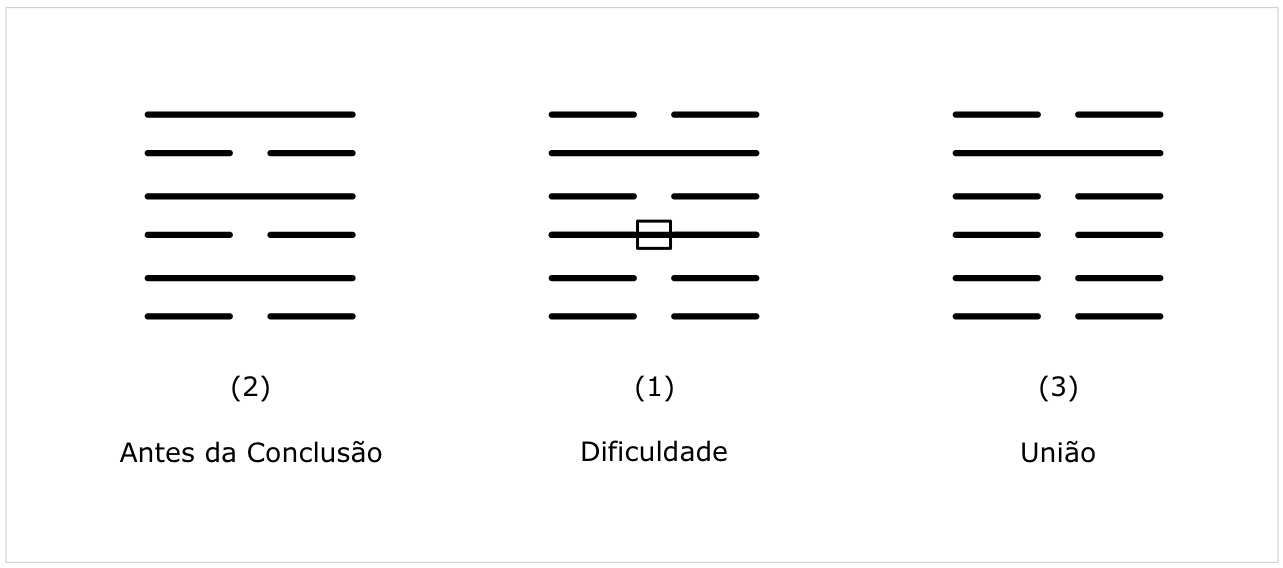 Quando vejo uma situação vivida de obstrução, bloqueio, penso logo no hexagrama A Dificuldade / Obstrução e através do desenho deste hexagrama entendo que: